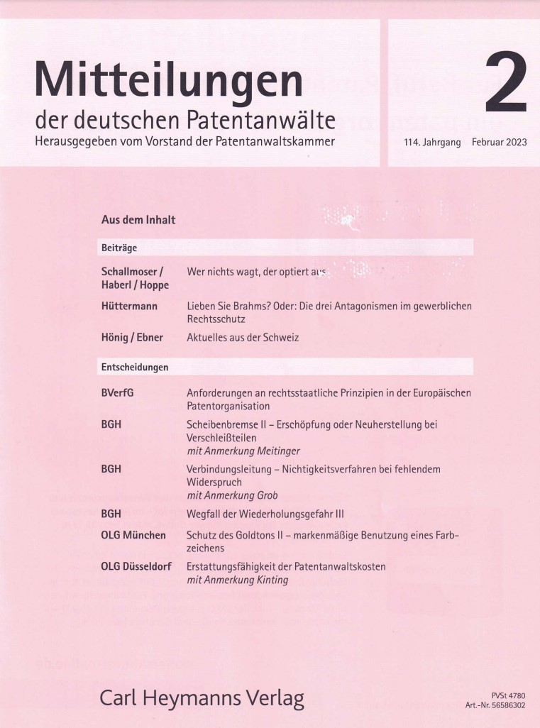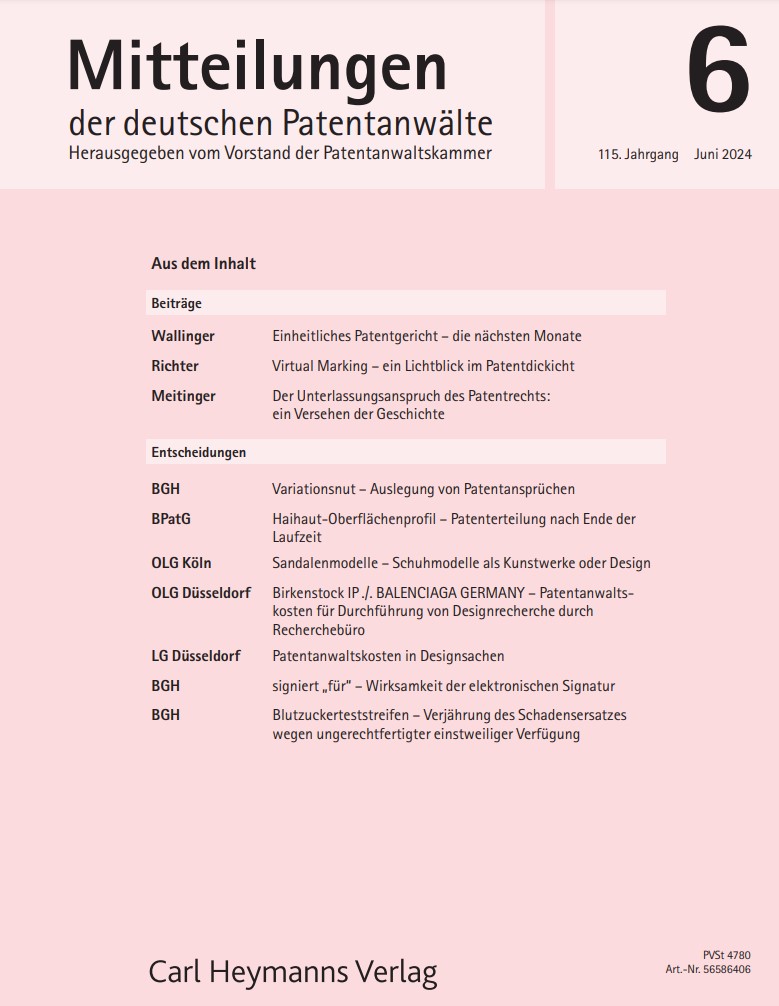 In der Juni-Ausgabe des Jahres 2024 weist Dr. Meitinger auf die Besonderheit hin, dass der Unterlassungsanspruch aus einem Patent von den Gründungsvätern des deutschen Patentgesetzes nicht gewollt war.