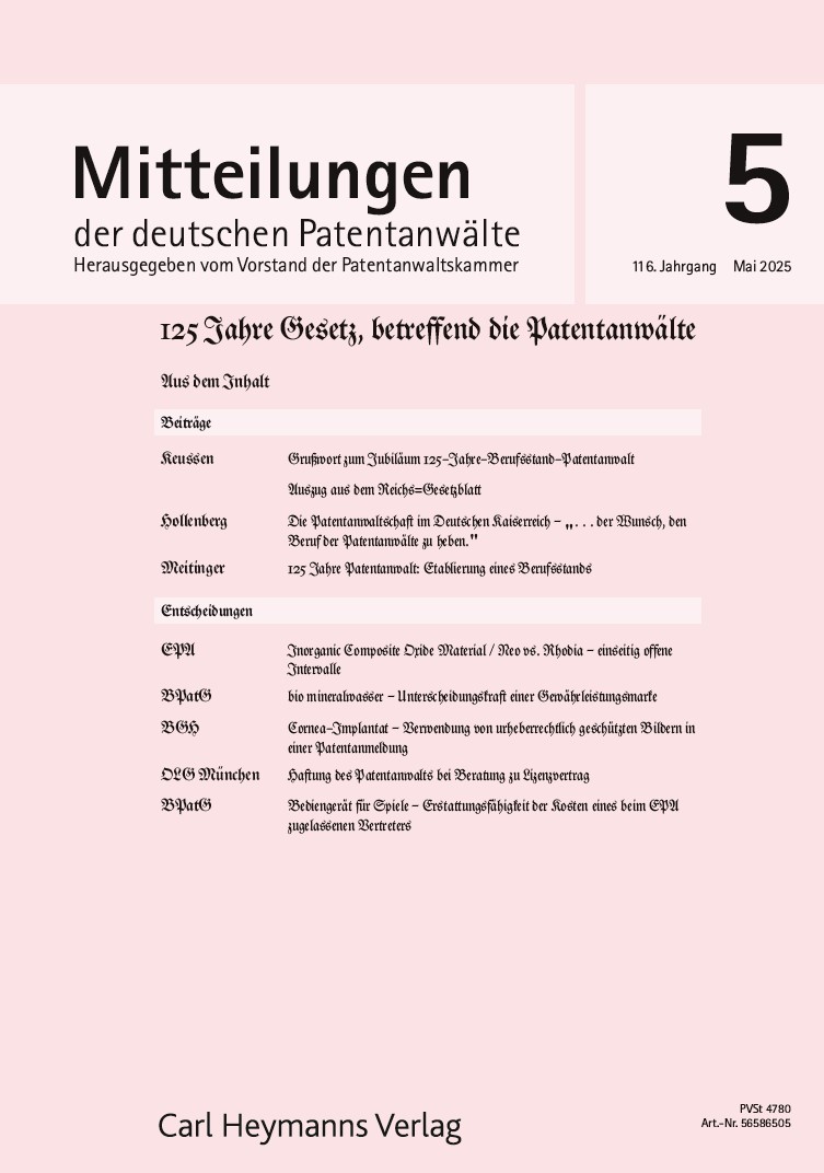 Dr. Meitinger beschreibt in der Jubiläumsausgabe vom Mai des Jahres 2025 die Herausbildung des Berufsstands der Patentanwälte während der letzten 125 Jahre.