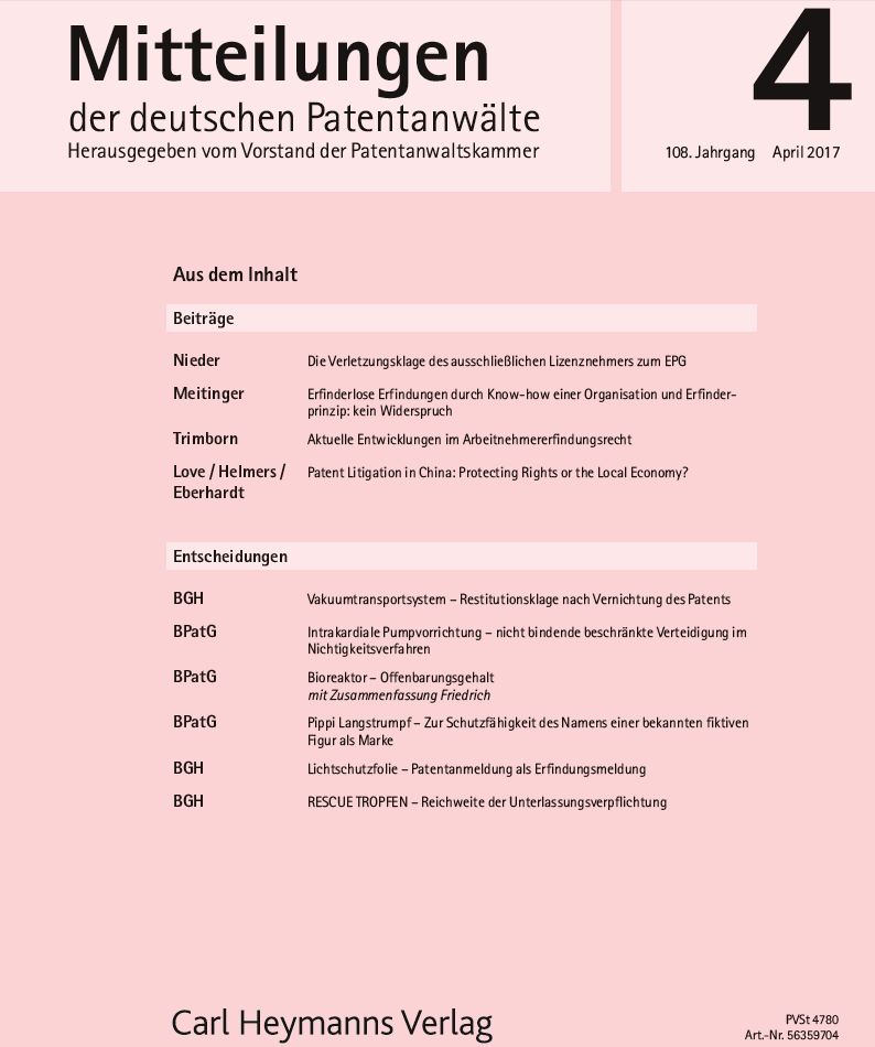 In diesem Artikel in der April-Ausgabe des Jahres 2017 wird beschrieben, dass "namenloses Know-How" einer Organisation eine Erfindung begründen kann. Der Urheber ist hierbei vordergründig das betreffende Unternehmen. Es wird vorgeschlagen, wie dieses Unternehmen bei der Zuordnung des Eigentums der Erfindung berücksichtigt werden kann, ohne dabei das Erfinderprinzip des Patentrechts zu verletzen.